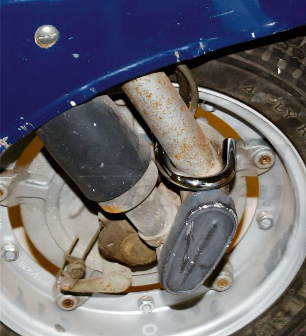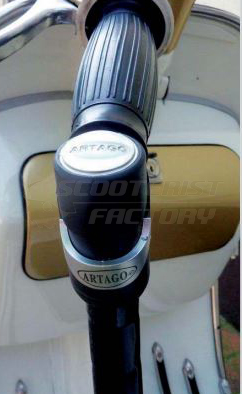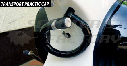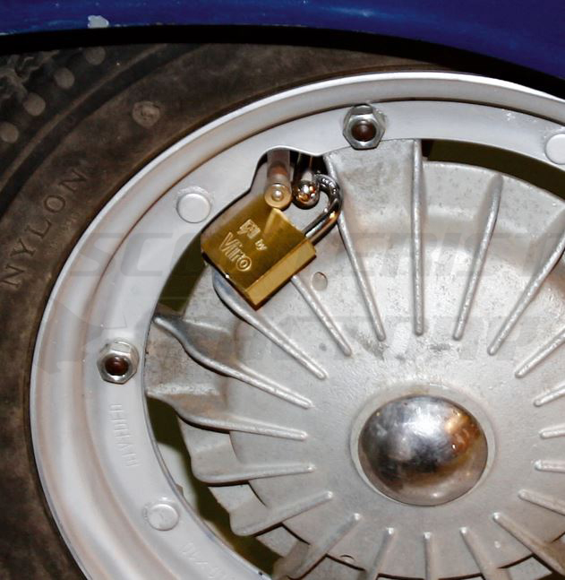 Antirrobo en llanta Vespa, va sujeta entre la horquilla y la llanta.