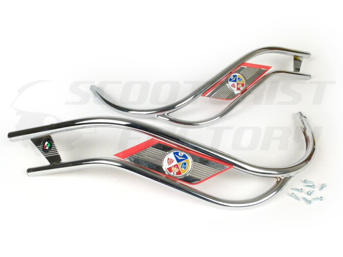 Bordón escudo cromado DOBLE Vespa chasis pequeño, Primavera, Súper, PKs-XL-FL. LOGOTIPO ROJO. Fabricado por Cuppini