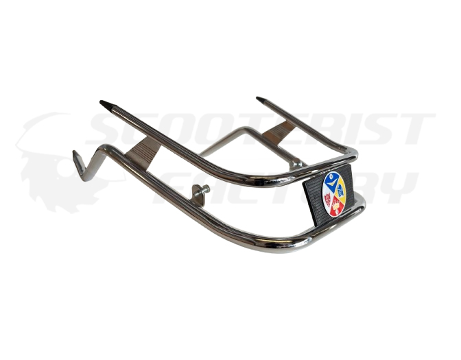 Defensa guardabarros Cuppini Vespa PX cromada fondo logo negro, válido para guardabarros de DS, DN
