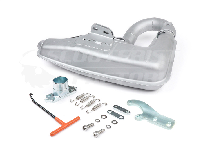 Escape BGM clubman Sport Lambretta PLATA. Basado en el Big Box V4, aporta más potencia gracias a su nueva cámara interna, teniendo que poner un silenciador para amortiguar el ruido. PARA SERIES 2 NECESARIO CAMBIAR AMORTIGUADOR POR UNO DE SERIE 3